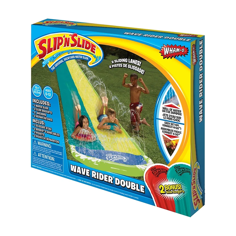 Make those hot days memorable with the original backyard water slide with dual sliding lanes! The slide measures 16 feet long with a wall of water on the bumper. Set up is easy with the Connect-N-Go garden hose system. Includes two bonus Slide Boogies.Contents include: 1 Water Slide, 2 Slide Boogies, 2 Anchors, 2 Repair PatchesFor 1-2 playersAges 5 to 12Made in ChinaBrand new condition in original packagingWipe clean with dry or damp cloth