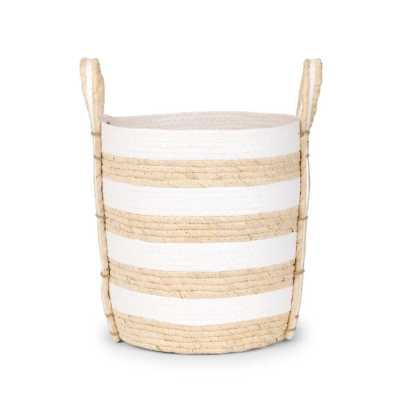 Our Small White and Natural Straw Braided Basket will add modern-organic charm to your home organization. Perfect for blankets, shoes, toys, and more, this storage basket helps keep clutter at bay. Basket measures 12H x 12 in. in diameter Handwoven with straw and paper braided handles Striped, two tone design Braided carrying handles Care: Spot clean. Contact your local Kirkland's store for availability. Quantities and selection may vary by location.
