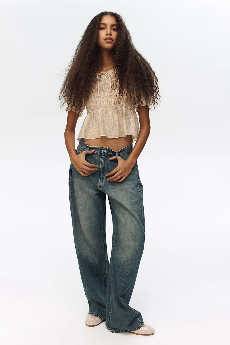 Blouse in a woven lyocell blend. Round neckline, decorative ties at front, smocking at bust, and short puff sleeves with ruffle trim and elastic at cuffs. Gently flared hem.