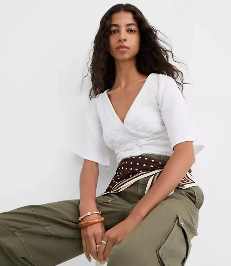 Smocked, ruched and fluttered, this touchably textured stretch cotton knit always knows how to fit and flatter. V - neck. Short sleeves, Hit: Hits at waist, Imported:, Length: 20"long, Fabrication: 98% Cotton 2 Spandex, Garment Care: Machine Washable Loft Smocked Flutter V - Neck Top Size 2XS Lemon Brulee Women's by Loft Size Regular - 2XS Lemon Brulee Women's Cotton, Blend V - Neck, Short Sleeve Shirts Tops Wear To Work 98% Cotton 2% Spandex Machine Washable