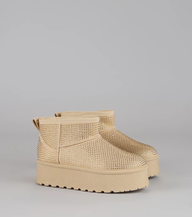 Where cozy meets full-on glam. These microsuede platform booties bring all-over rhinestone shine and plush faux fur warmth—perfect for stepping out or staying in with sparkle in your stride.