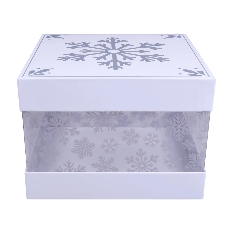 Use this treat box to gift handmade desserts and Christmas cookies this holiday season! It features a festive snowflake design on the clear acetate sides and one big snowflake on the top lid. You can add parchment paper to the bottom of the box to add to the aesthetic and serve the practical purpose of keeping the treat box clean.Details:Gray and white7" x 7" x 5" (17.7cm x 17.7cm x 12.7cm)400 gsmFood safeWhite board paper and acetate PETCare & Usage:Treat boxes are one-time use and disposableDo not place in microwave or oven