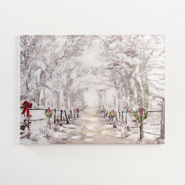 The delicate style of this Snowy Drive Canvas Art Print will give your walls the perfect seasonal touch. It will have you ready for a snowy adventure! Art measures 39.38L x 1.5W x 29.5H in. Distinctively printed on stretched canvas Wrapped edges complete the look Features snowy, wreath-lined street landscape Hues of white, gray, red, green, and brown Weight: 3 lbs. Hangs from back-mounted hardware Care: Dust with a soft, dry cloth. Contact your local Kirkland's store for availability. Quantities and selection may vary by location.