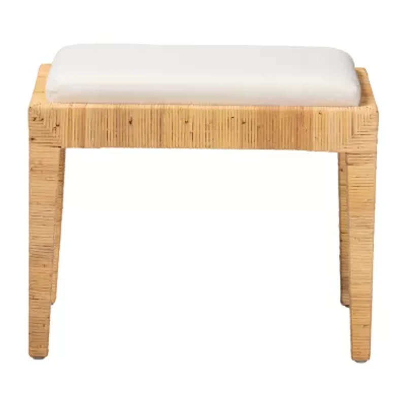 Elevate the atmosphere of any arrangement with the boho flair of the sofia ottoman. handmade in indonesia, this chic piece consists of a solid mahogany wood frame enveloped in natural rattan for a relaxed, tropical look. the sofia will arrive fully assembled and is padded with plush foam and upholstered in soft fabric for a cozy embrace. tapered legs lend a modern outline, making the sofia ottoman an injection of bohemian flair to any layout.