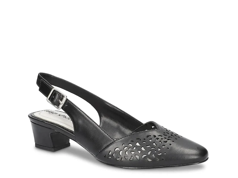 Comfort meets chic style in the Easy Street Sophie pump. The low block‑heel pump displays a V-throat design with cutouts, blending fashion and ease. An adjustable slingback strap ensures a personalized fit, while a padded insole keeps you feeling great all day.