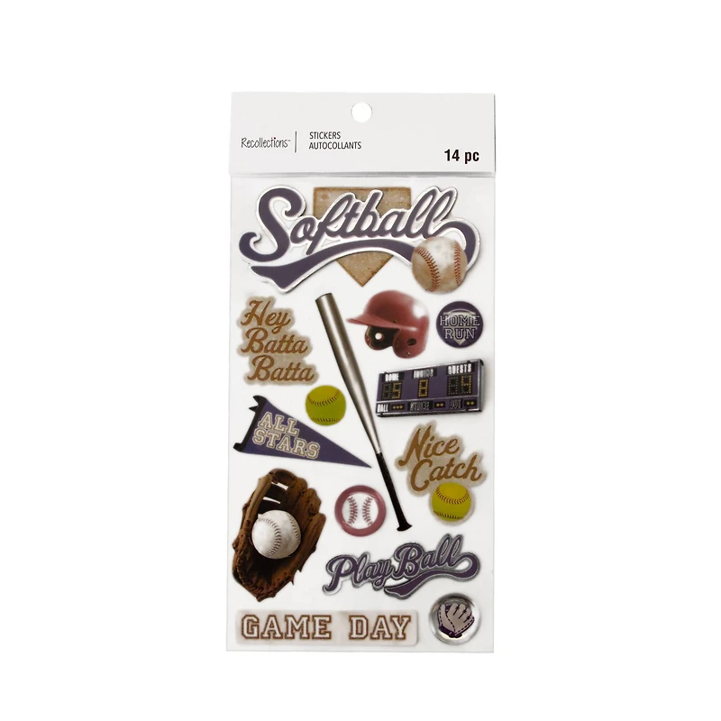 Embellish one-of-a-kind cards, scrapbook pages, planners and more with this fun assortment of dimensional stickers from Recollections. Perfect for adding eye-catching focal points and depth to your paper projects, this set of sports themed stickers is a great addition to your crafting collection.Details:Softball design3.875" x 6.875" (9.84cm x 17.46cm) sheet size14 stickersPaper, plastic and EVA foam