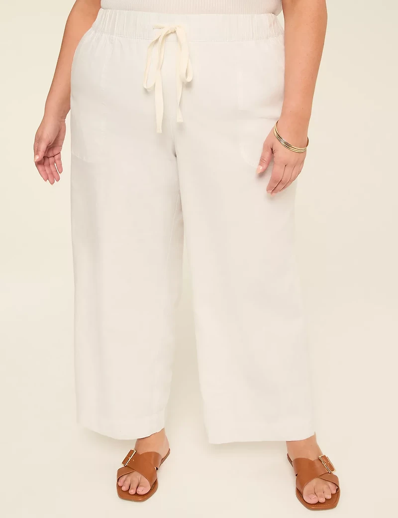 Available in Plus Size Breezy wide leg pants in our soft linen blend that will be your go-to, breathable pair for this season (and next). FIT: Covered elastic waistband with drawstring Leg Shape: Wide Leg. Relaxed and easy wide leg opening from hip to hem. Inseam: Petite: 27", Regular: 29", Long: 32" YOU ASKED, WE LISTENED! Your favorite, oh-so-breathable linen wide legs in a shorter 29" (regular) inseam that perfectly hits at your sandals & sneakers for all-day, easy movement. Rise: Mid FABRIC: Linen - a light and breathable blend with the perfect amount of stretch. Machine wash cold with like colors. Only non-chlorine bleach when needed. Reshape and line dry Cool iron if needed. 53% Linen 45% Rayon 2% Spandex FEATURES: Two front pockets Elastic tie waist Item Number #414781 Imported Plus Size Pant ". Plus Size Softest Linen Wide Leg Pants, in White, 16, Women's, Lane Bryant