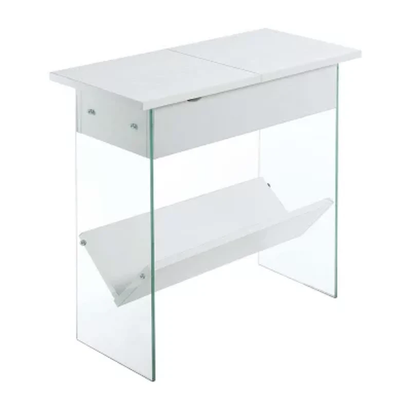 Take functionality to the next level with the Soho glass flip top end table with charging station and shelf by Convenience Concepts. Features a flip top that opens to reveal ample storage space and a charging station. Charging station includes two standard outlets and two USB ports. Also provides a cable management hole that allows you to place your device on the table without damaging your cord. The power supply cord is 6 feet in length giving you the room you need to display your end table where you choose. The two tempered clear glass side panels create a magical illusion that the shelf is floating, giving it a modern contemporary style that will refresh your home decor. The top component and shelf are crafted from particle board that is finished with a rich melamine paper. This two tier unit is durable and easy maintenance. Set up in your living room, den or home study, its versatility is endless. Available in multiple finishes to easily complement your current ensemble. Pair with more pieces from the Soho Collection by Convenience Concepts, each sold separately.