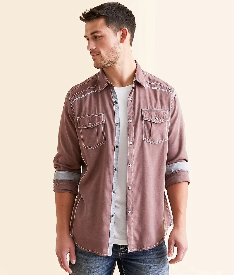 Woven pearl snap front shirt Athletic fit is larger in the shoulders, chest, waist and arm holes and is longer in the arms and body Contrast trim Easy Care fabric is a poly/cotton blend that helps prevent wrinkles