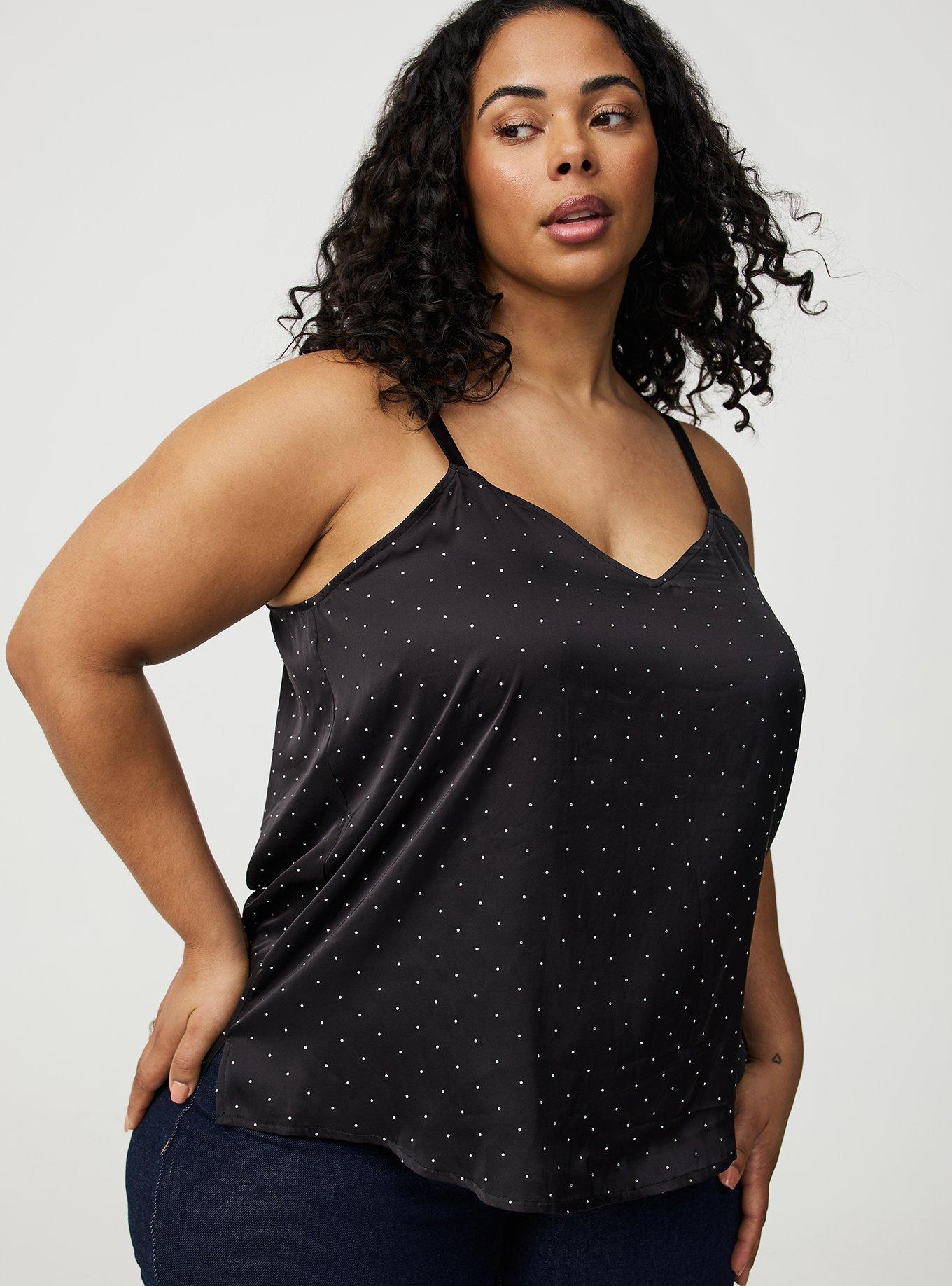 FIT Adjustable straps. Relaxed, swingy fit. Measures 30'' from shoulder (size 2). MATERIALS + CARE Stretch satin woven fabric. 95% polyester, 5% spandex. Machine wash cold. Dry low. Imported. DETAILS V-neck; V-back. Sleeveless. Rhinestone details. WHY WE LOVE IT Whether you style it on its own or with your favorite jacket, this lightweight top is not only stylish, but also a customer favorite.