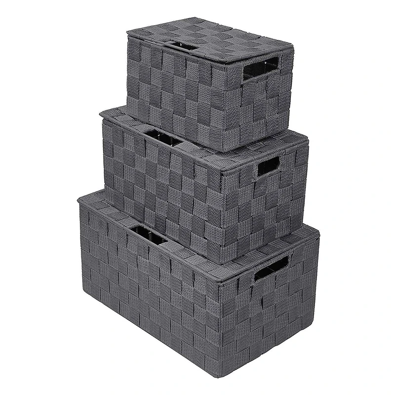 The Sorbus basket bin with lid set offers a decorative way to organize your space. It features three baskets of various sizes to organize your essentials with a lid closure. Store your favorite keepsakes, photos, office supplies, travel sized products, and much more. For easy transport, the sturdy handles on each side make this set portable for carrying around the home. Designed with a practical basket weave pattern, this set beautifully complements your cube organizer, shelf, floor, or tabletop. Details:Available in multiple colors3 piece setIntegrated handles for easy transportRemovable lid closure conceals contentsMade of durable polypropylene ribbon secured to stainless steel frame to maintain shapeSmaller baskets stack/fit inside larger baskets for storageTo clean, simply wipe with a damp spongeSize Information:Large: 13.5" x 8.75" x 6.87"Medium: 11" x 7" x 6"Small: 9" x 5.5" x 5.25"