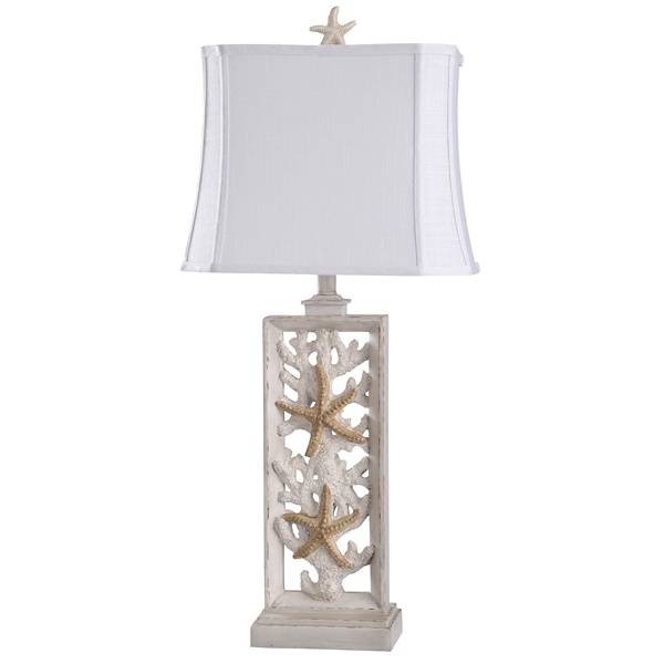 Take your lighting under the sea with this South Haven Stacked Starfish Table Lamp! Its beachy details and natural colors make it the perfect choice for a coastal home. Lamp measures 33H in. Crafted of polyresin Stacked coral base with starfish details Distressed white finish with tan accents Softback rectangle bell shade in white fabric with a starfish finial Shade measures 15L x 9.5W x 11.5H in. Socket accommodates a three-way, 100-watt bulb Features a clear, plug-in cord Care: Dust with a soft, dry cloth. Do not exceed specified wattage. This item is available at Kirklands.com only, not available in stores. Please note: this item cannot be shipped to APO/FPO addresses.