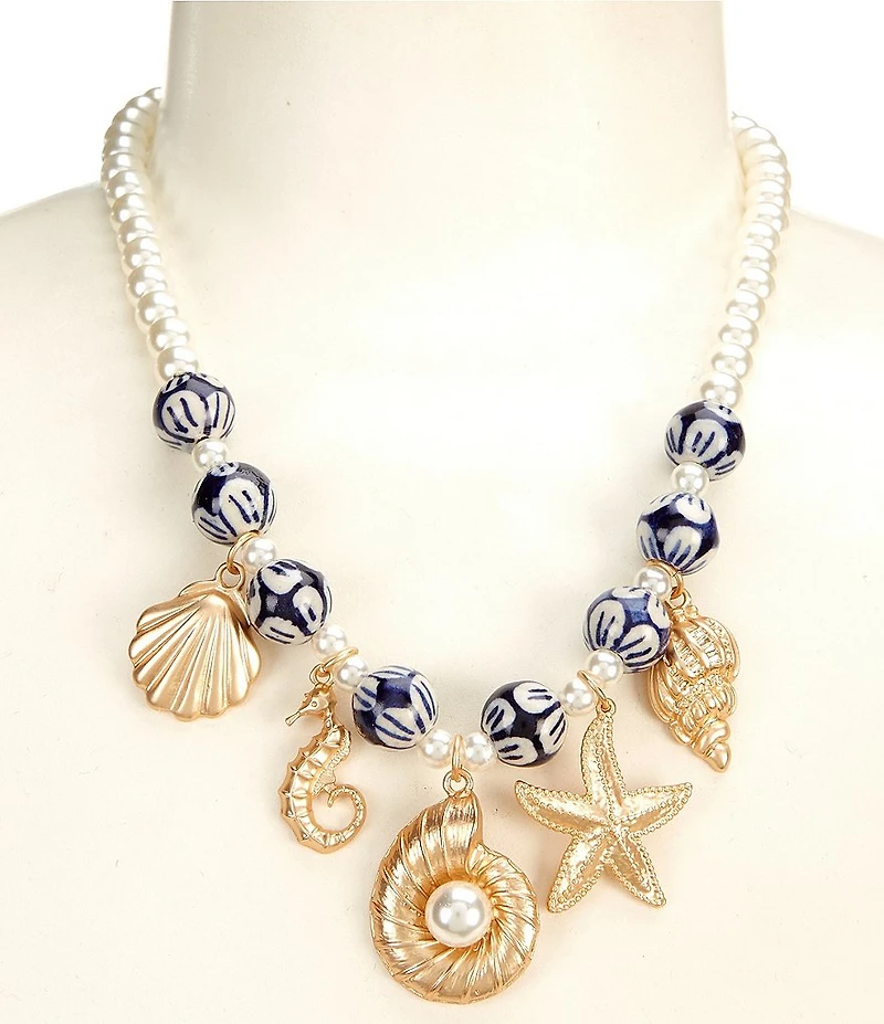 Southern Living Sealife Charm Drop Navy Floral and Pearl Beaded Collar Necklace