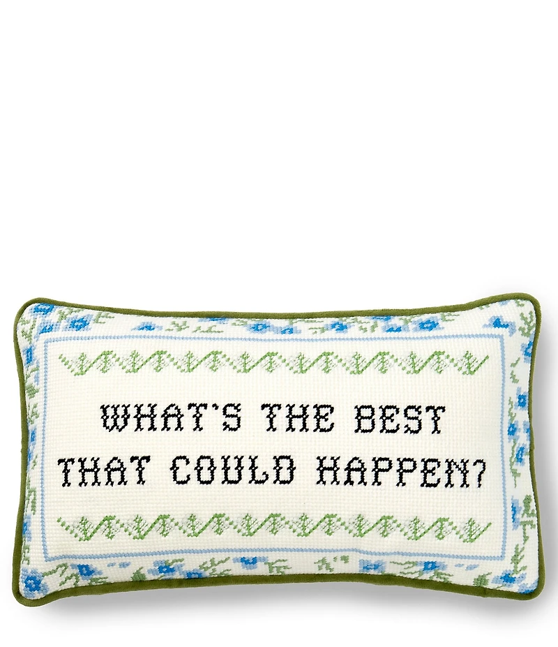 From Southern Living, this pillow features: Needlepoint face Solid knit back "What's The Best That Could Happen" verbiage Approx. 8" x 14" 100% Polyester; polyester fill Spot clean Imported. Southern Living is a trademark of TI Lifestyle Group, LLC, a subsidiary of Meredith Operations Corporation, and is used under license.