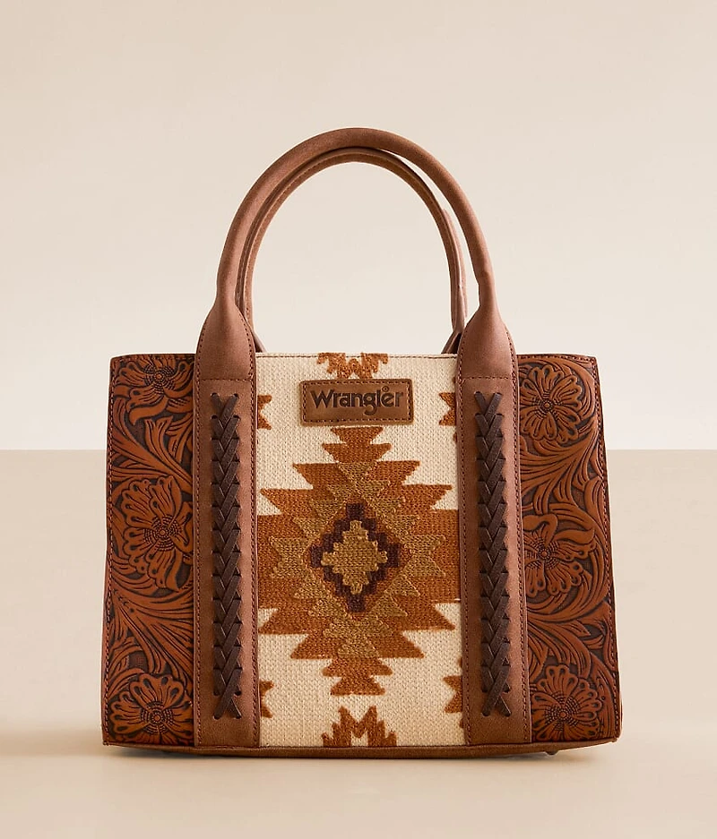 Pieced embroidery and tooled faux leather lined tote Zipper closure Interior zipper and two pouch pockets Removable shoulder strap Dimensions: 10 1/2"(L) x 3 1/4"(W) x 8 1/2"(H)