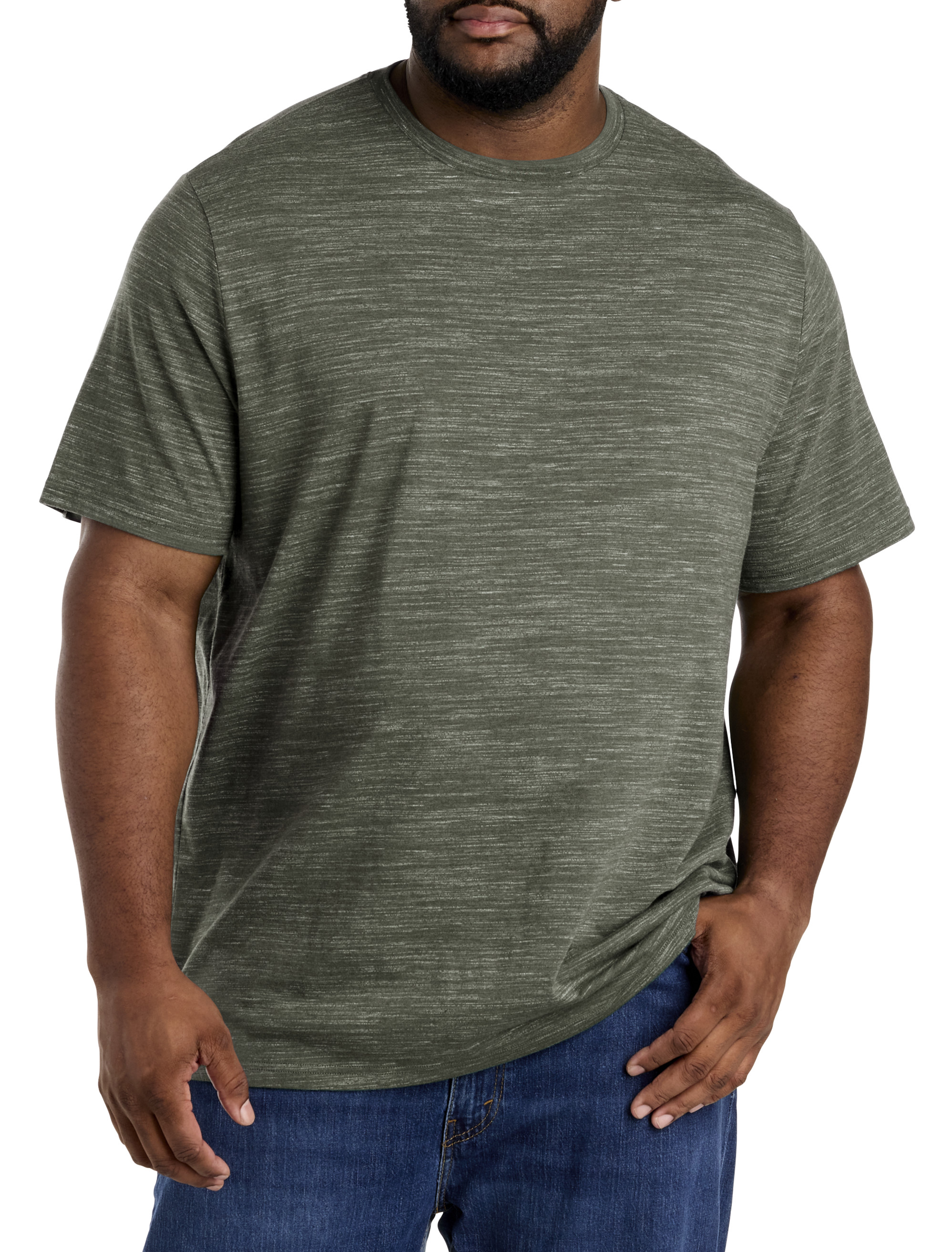 Improved fit! From Harbor Bay, this contemporary T-shirt offers a cool look whether worn on its own, or layered under an open sport shirt. The space-dyeing sets this apart from your standard solid tee.