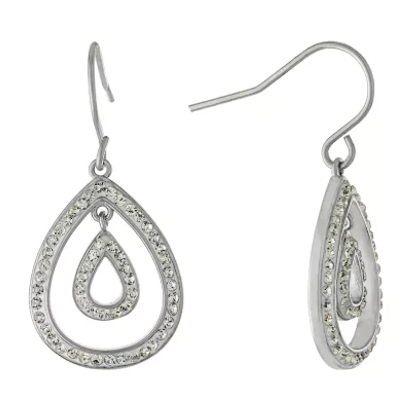 Sparkle and shine best describes these Sparkle Allure pure Silver over Brass crystal pear drop earrings. Earrings are crafted in pure Silver over Brass, feature beautiful sparkling crystal stones, 31mm in length and have French wire backing. Wear these crystal pear drop earrings with any wardrobe choice. Earrings are boxed for gift giving! Wipe earrings clean with a soft cloth.