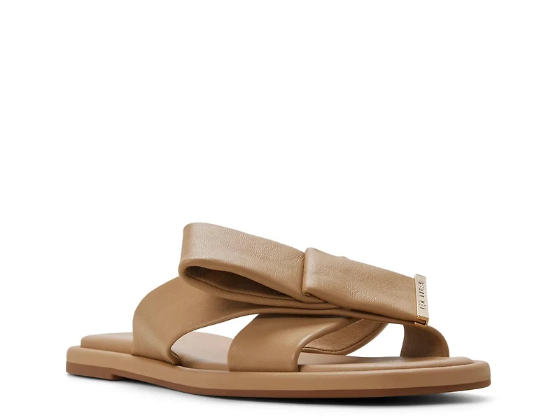 Sharpen your look with the Spencer sandal by Ted Baker. This slide sandal features a sleek silhouette with a square open toe and a sculptural bow accented by subtle hardware, creating a modern and refined statement.