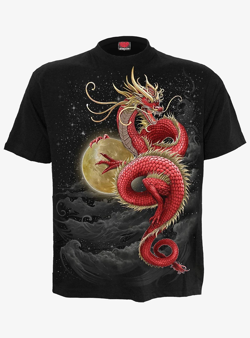 Twisting high up into the night sky, the serpentine form of Shenlong holds the spectral moon as if it was a crystal ball. His scales reflect the light, scattering it in all directions and creating the stars of the universe on the black canvas above, while the swirling clouds undulate peacefully like a misty river below. Front Print T-Shirt Black is made of Top Quality 100% Cotton, Jersey using skin friendly, Azo-free, Reactive dyes. Item cannot be shipped to P.O. Boxes