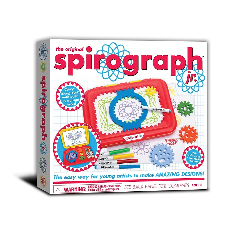 Calling all aspiring artists! Now even the youngest creative minds can make amazing designs with the Spirograph Jr. design set! Jumbo-sized pieces make creating Spirograph art fun and easy for little hands, and an easy-to-carry drawing tablet doubles as a work station and handy storage case to keep everything neat. The set includes easy-to-use gears, 5 washable markers, 24 pages of design paper and a handy instruction guide. Start their minds spinning with Spirograph Jr.!Contents include: Carry-Along Case with Built-in Design Desk, Storage, and Gear Frame, Gear Ring, 4 Gears, 8-Page Design Guide Book, 5 Art Markers, 24-Page Design Paper PadFor 1 playerAges 3 and upMade in ChinaBrand new condition in original packagingWipe clean with dry or damp clothWarning: Choking Hazard - Contains small parts not suitable for children under 3 years.