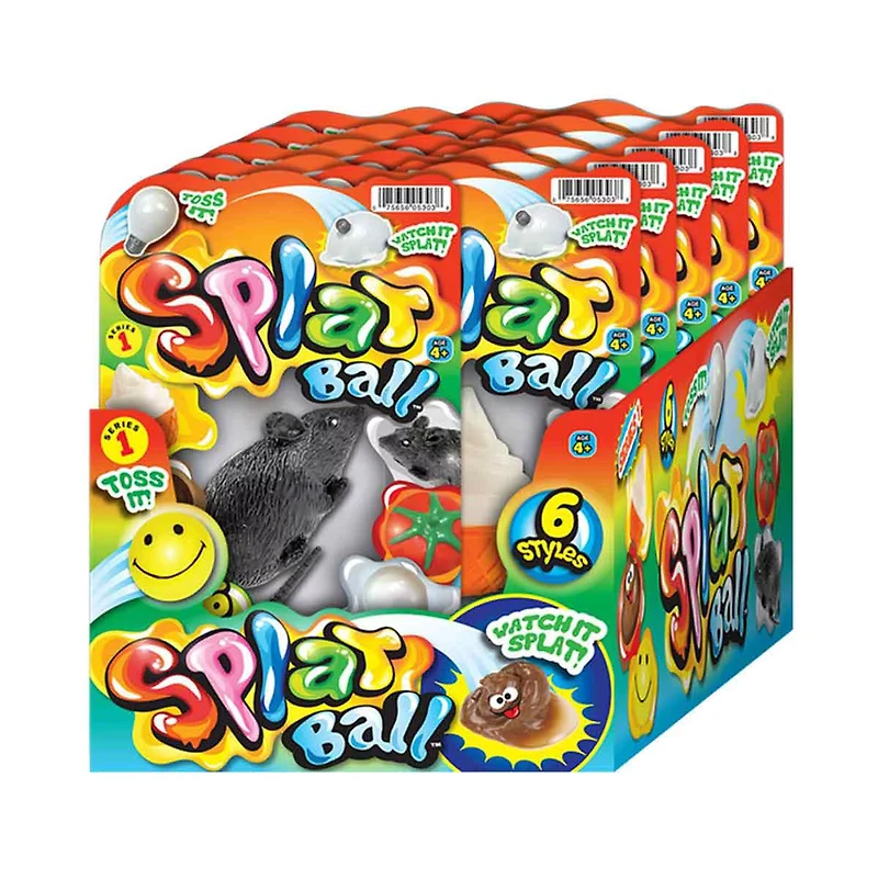 Splat Ball comes in an assortment of 6 styles! Toss the splat ball at a smooth slick surface and watch it flatten out and then reform.