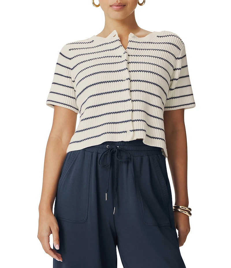 From Splendid, this shirt features: Knit fabrication Round neckline Short sleeves Striped Straight hemline Button up front closure Approx. 18.75" length Cotton Dry clean only Imported.