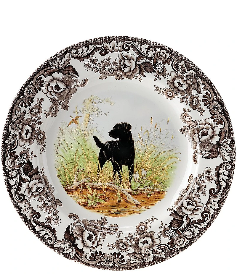 From the Festive Fall Collection by Spode, this salad plate features: Black Labrador Retriever decal floral border approx. 8" earthenware dishwasher and microwave safe oven-safe up to 225°F Imported.