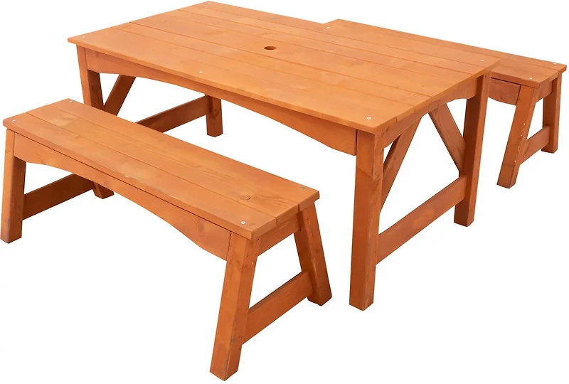 Kids can relax, do homework, work on art projects or share sandwiches on the Sportspower Kids Wooden Picnic Table with Separated Bench. Northern Europe Scandinavian Fir wood delivers enhanced stability while A-frame legs provide a sturdy base. An umbrella hole lets you keep your little ones in the shade.