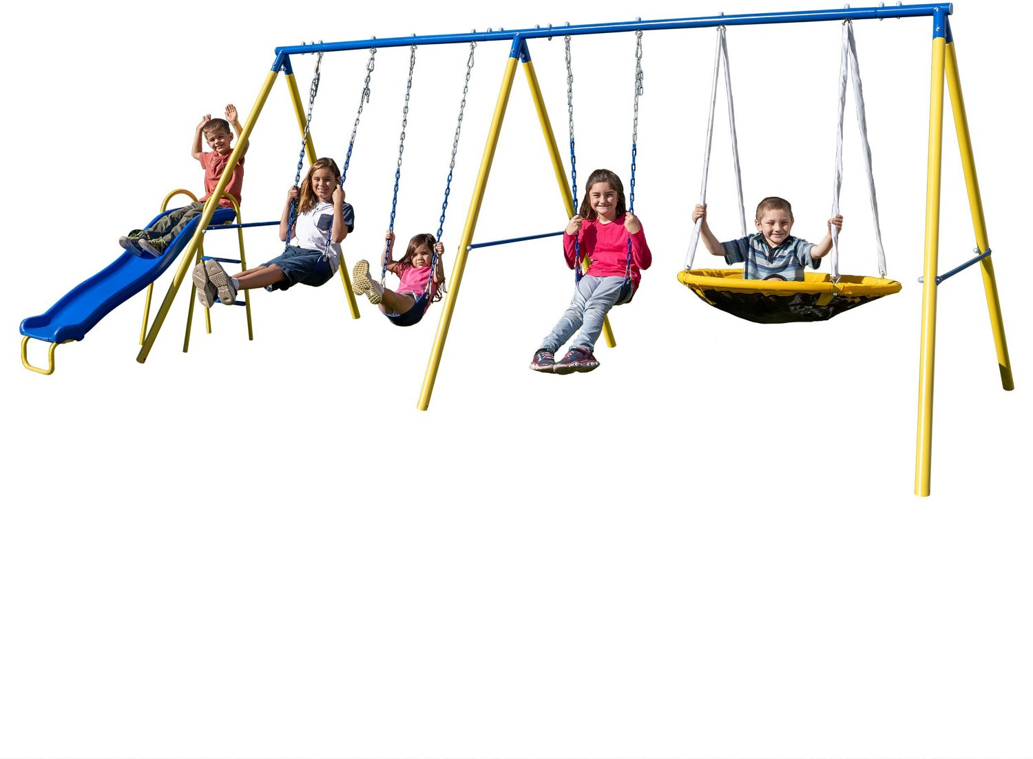 Swing for the stars with the Sportspower Triple Swing and Saucer Set. 3 sling-style swing seats, a 5 foot slide, and a 2-person flying saucer offer out-of-this-world fun for up to 6 kids. The heavy-duty steel frame provides a stable base and is powder-coated to resist weather and corrosion. Adjustable chains grow with your kids and are rubber-coated for protection against pinching.