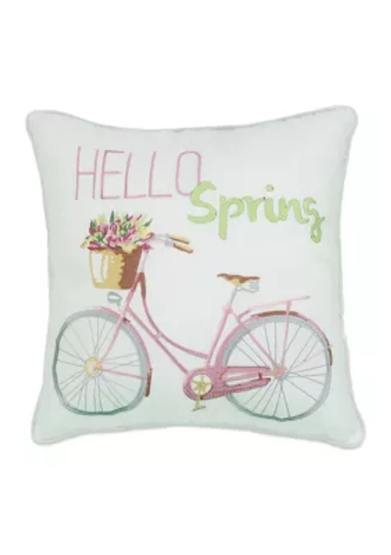 This pillow features a "hello spring!" novelty bicycle with a basket of flowers with appliqué and embroidery details. Imported Product Specifications 18" x 18" Material & Care Polyester Spot clean only