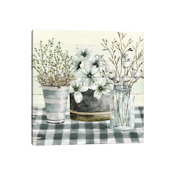 Enhance the elegance of your space with our Spring Floral Gingham Canvas Art Print. Showcasing three vases full of different plants of various shades of green, white, cream, and teal, this canvas is sure to bring life to your wall. Overall dimensions Width: 18 in. Depth: 1.5 in. Height: 18 in. Giclee printed on stretched, poly-cotton blend canvas North American pinewood frame around wrapped canvas Features flowers in vase subject Hues of white, cream, teal, brown, and gray Weight: 4 lbs. Artist: Carol Robinson 100% Made in USA by highly trained craftsmen Hangs from back-mounted hardware Care: Dust with a soft, dry cloth. This item is available at Kirklands.com only, not available in stores. Please note: this item cannot be shipped to APO/FPO addresses.