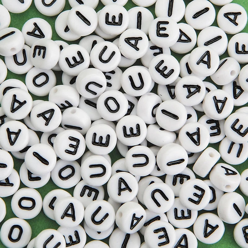 Accentuate your DIY jewelry creations with these plastic vowel beads. These beads are easy to use and will be the perfect addition to your little one's craft kit. Use them with bright cords and charms to make keychains and bracelets. Pack includes 40 A's, 40 E's, 36 I's, 14 O's and 14 U's.Details:White and black6 mm bead size1 mm hole size144 beadsPlasticFor ages 6 and up