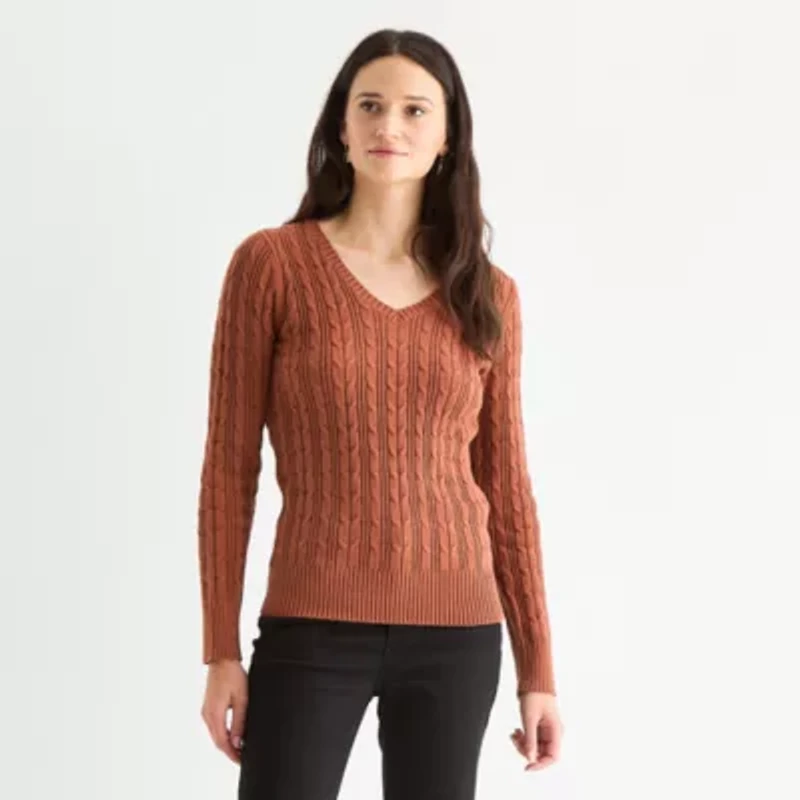 St. John's Bay Womens V Neck Long Sleeve Cable Knit Pullover Sweater