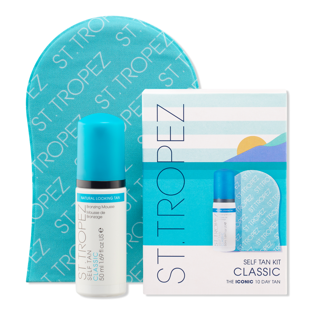 SELF TAN CLASSIC MINI KIT. Benefits: An easy-to-apply tinted mousse to guide application for no missed patches. Lightweight and quick-drying with no transfer onto clothes or bedsheets. Rinse off after 8 hours for a natural golden tan that lasts for up to 10 days with even fade.. 100% clean, vegan-friendly & natural tanning activ. Medium Golden Tan. Apply with a mitt to seamlessly blend for a streak-free finish and stain-free hands. No self tan smell with this mood-boosting signature fragrance. Includes: Classic Bronzing Mousse (1.69 oz). Double Sided Applicator Mitt (1 ct). :