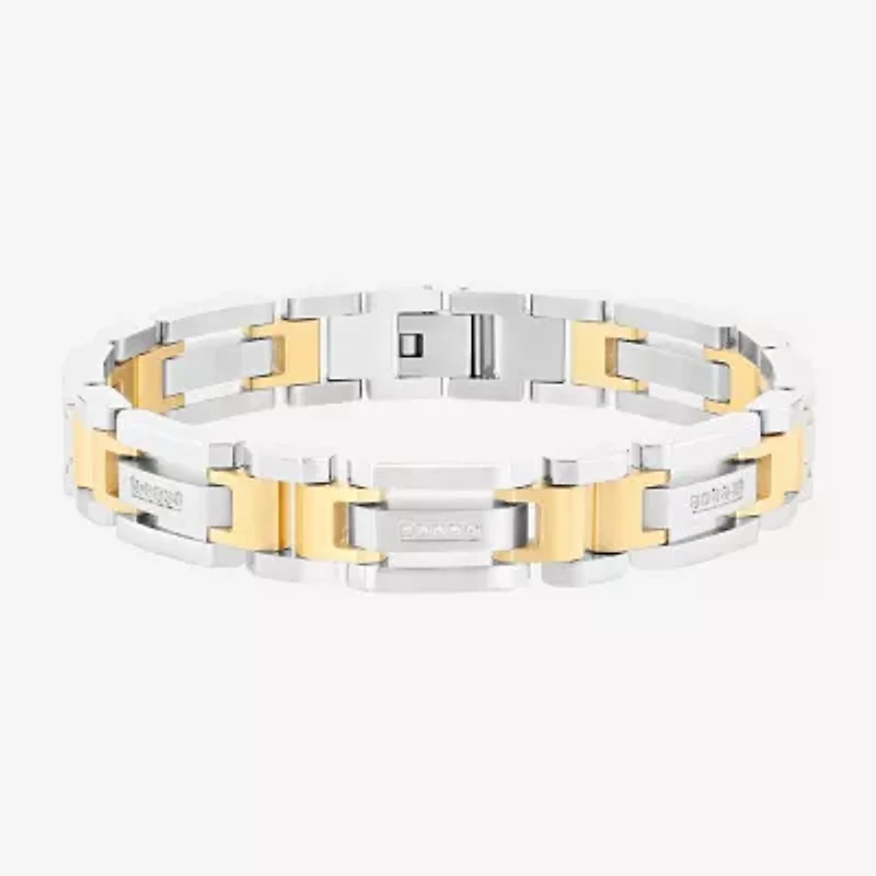 Clean and subdued, this link bracelet features two-toned stainless steel and rows of white diamonds. Perfect for pairing with a crisp button-up or classing up a favorite tee.