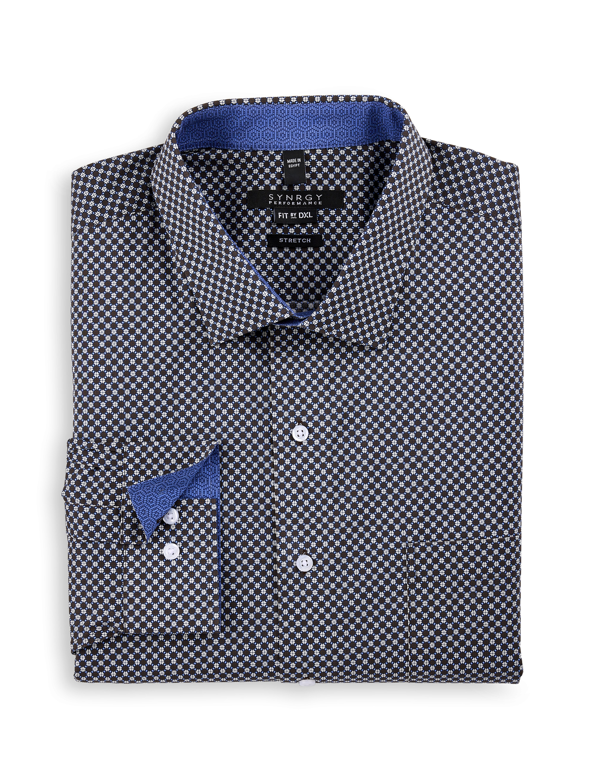- Spread collar with contrast print stretches up to an extra half inch for comfort