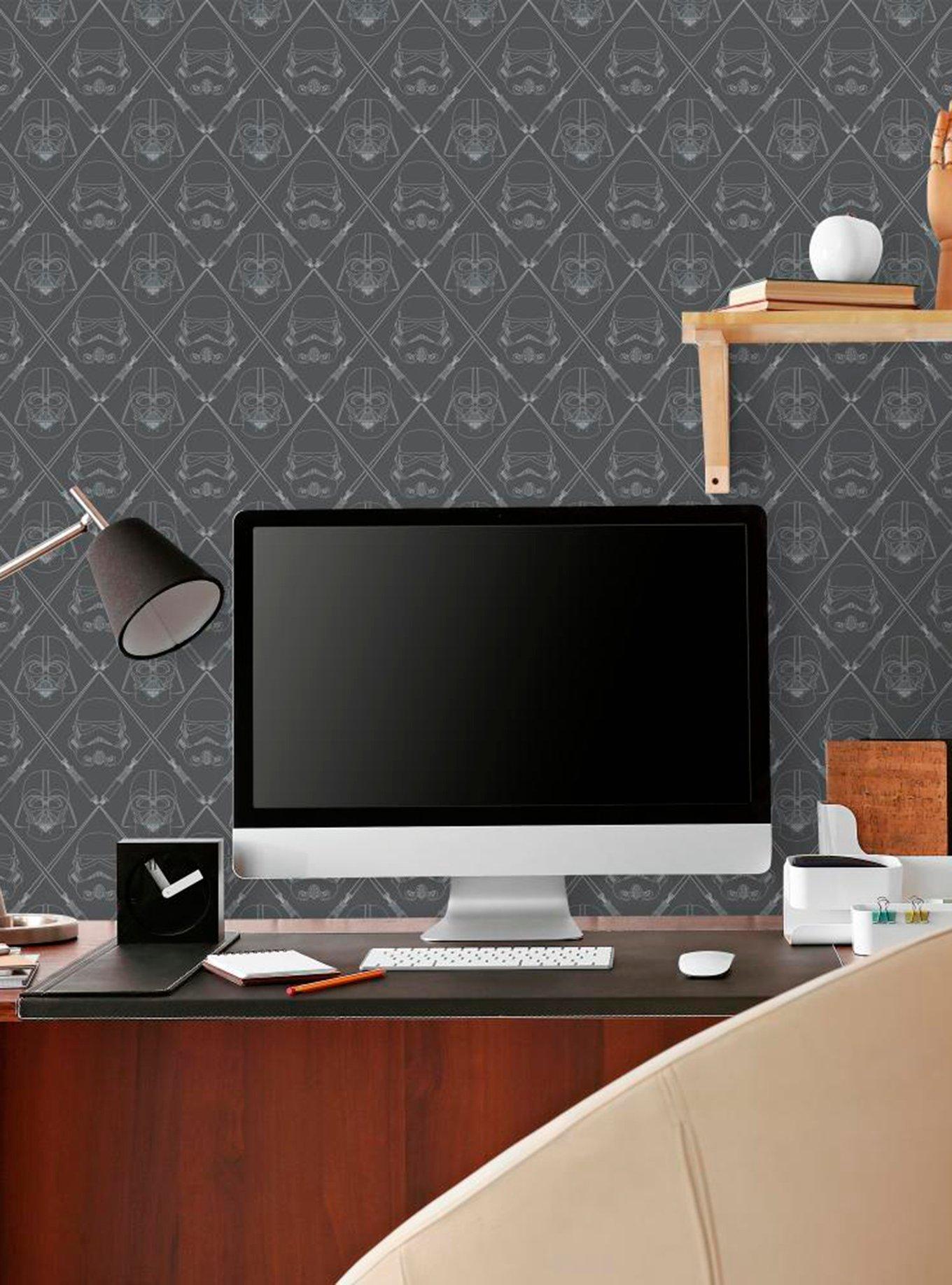 Give the walls of your Death Star an edgy transformation with this Dark Side-inspired wallpaper from Star Wars . The peel and stick wallpaper features stormtrooper and Darth Vader helmets with a diamond pattern made out of lightsabers.
