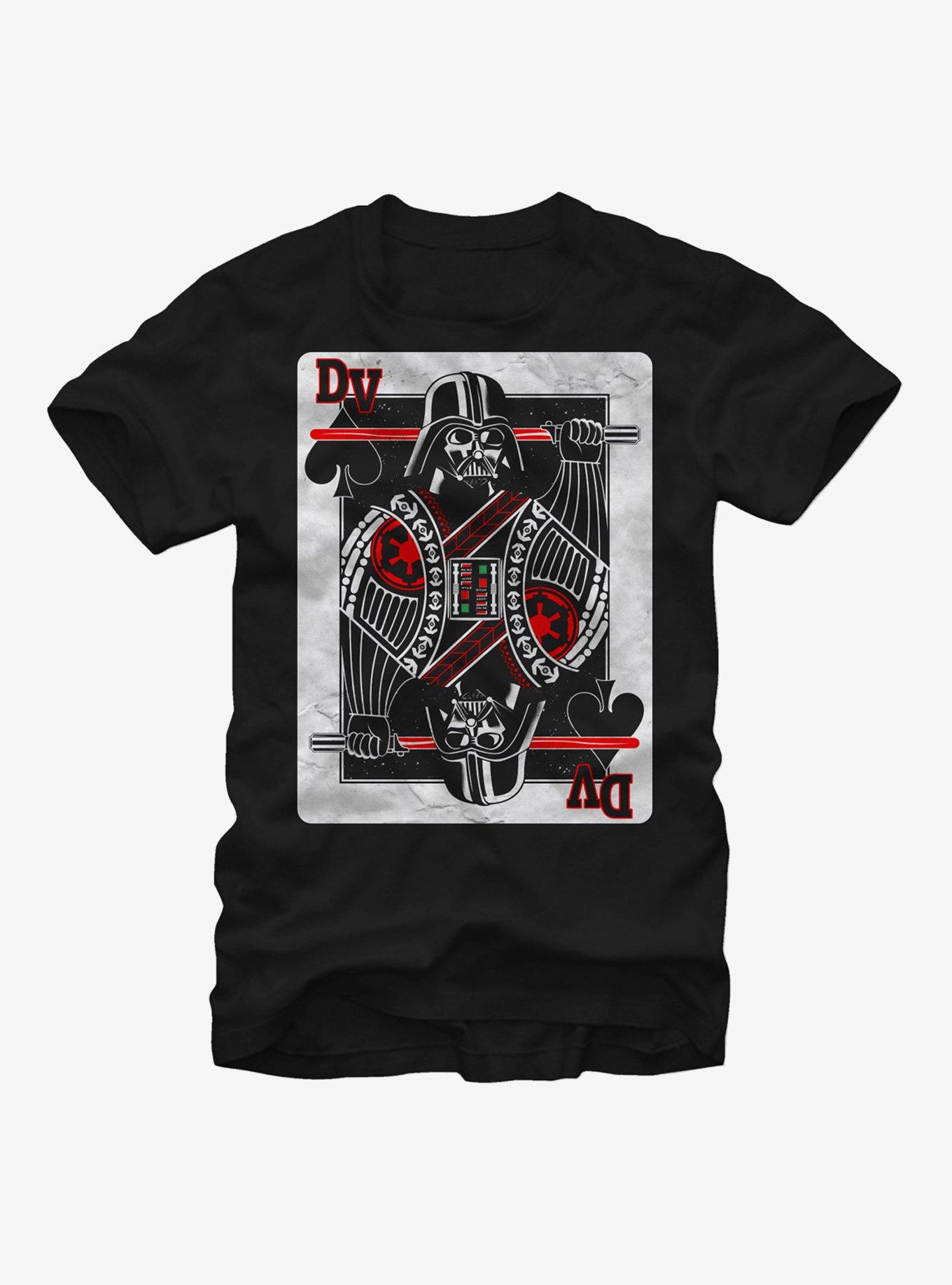 The classic playing card gets an Empire-themed makeover to bring you the Star Wars Darth Vader King Black T-Shirt. Darth Vader takes the role of king on this unique Star Wars t-shirt, with his famous red lightsaber in hand. 100% Cotton.