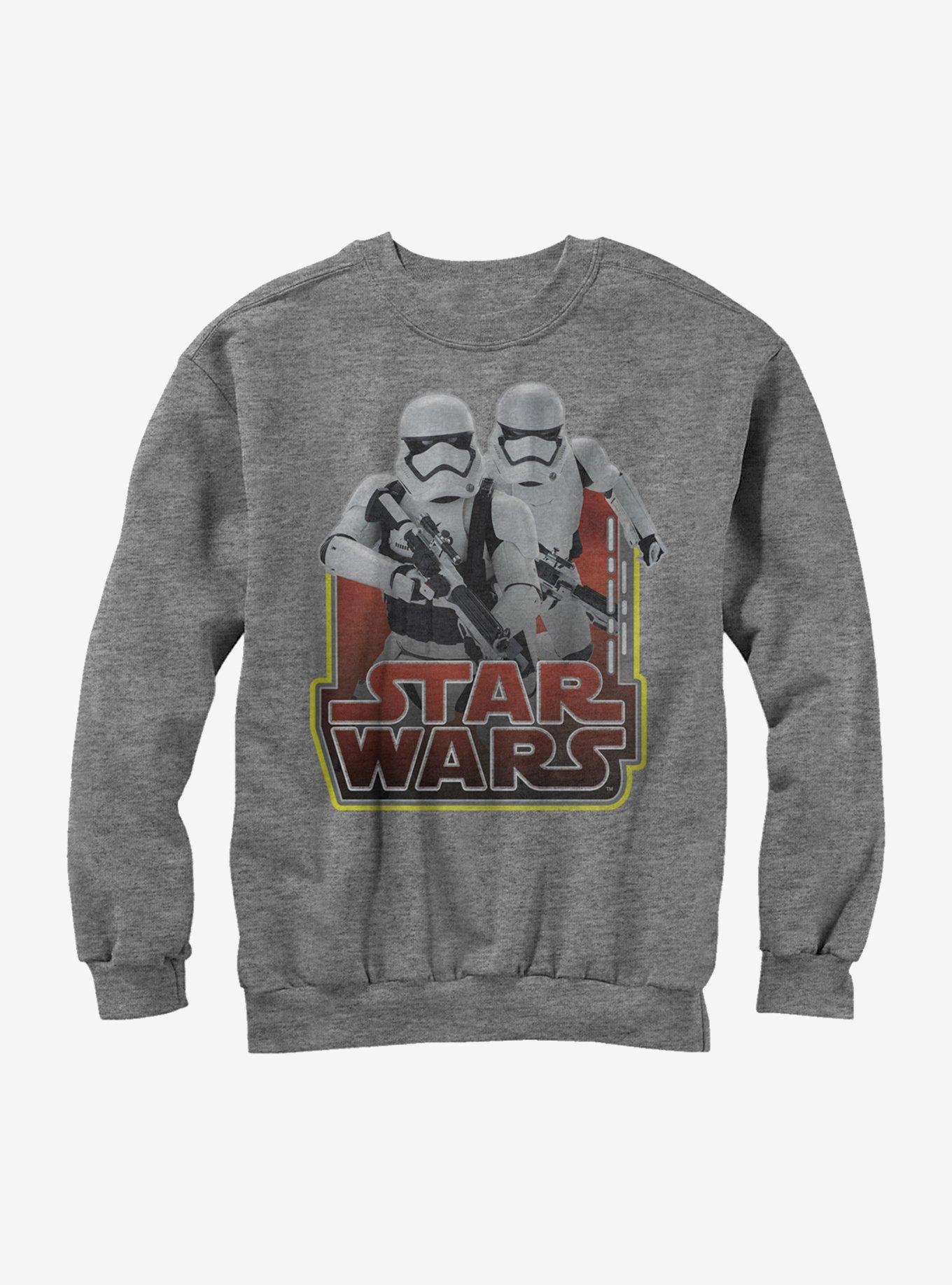 Join General Hux and try to stop the resistance with the Star Wars Episode VII First Order Stormtroopers Heather Gray Sweatshirt. Two stormtroopers with blasters charge into battle above the Star Wars logo in a vintage-style print on the front of this gray Star Wars sweatshirt. 75% Cotton, 25% Polyester.
