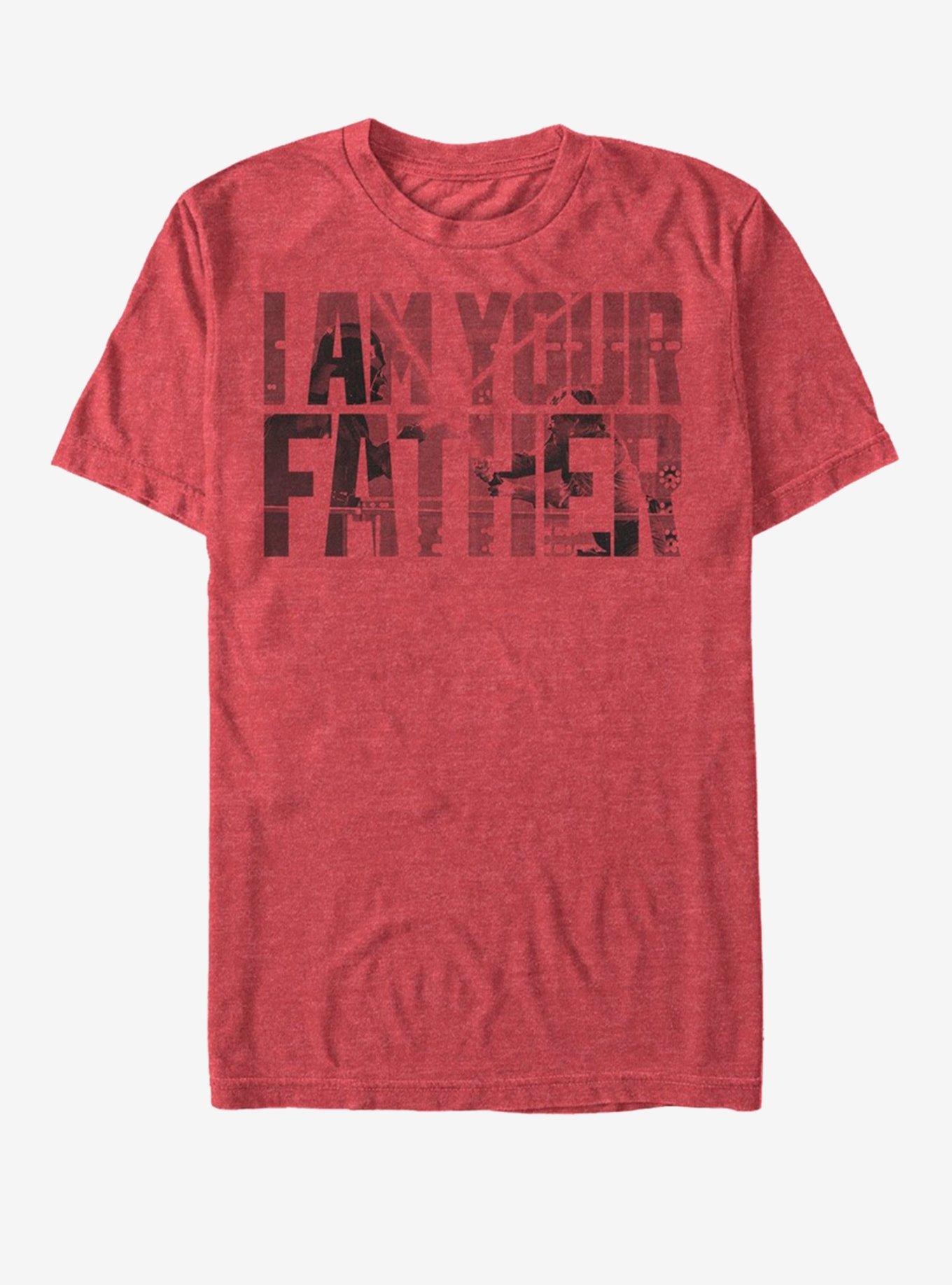 When dad has a Dark Side. Our lightweight heather red Star Wars tee features a glimpse of the epic lightsaber battle between Darth Vader and Luke Skywalker within text that reads, "I Am Your Father."