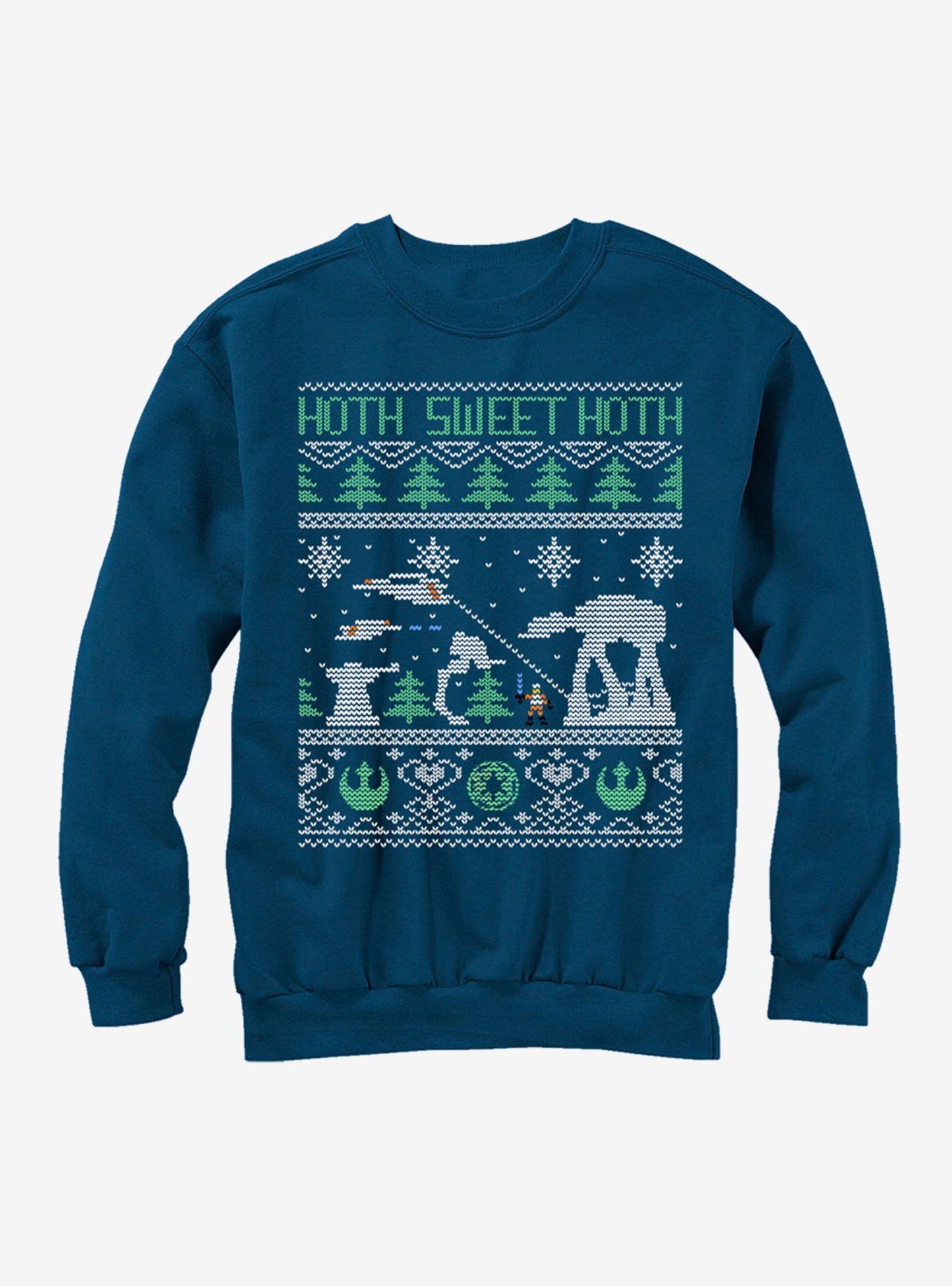 The weather on Hoth is frightful, but the fire and the Star Wars Hoth Sweet Hoth Ugly Christmas Sweater Oversized Red Sweatshirt are so delightful! An AT-AT, Luke Skywalker, an AT-ST, and more come together to create an ugly Christmas sweater style print below the words "Hoth Sweet Hoth" on this awesome red boyfriend cut Star Wars sweatshirt. 50% Cotton, 50% Polyester.