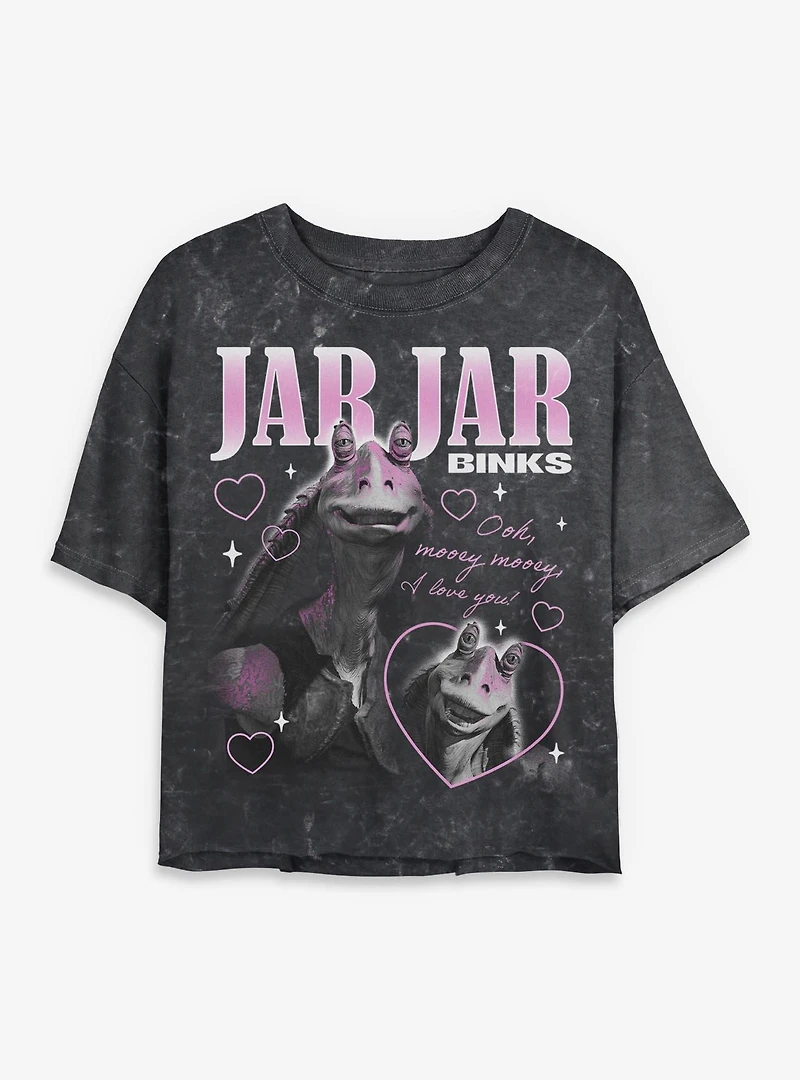 Product ID: 36451555 Star Wars Jar Jar Binks Loves You Womens Mineral Wash Crop T-Shirt BoxLunch Exclusive Product ID: 36451555 Star Wars Jar Jar Binks Loves You Womens Mineral Wash Crop T-Shirt BoxLunch Exclusive