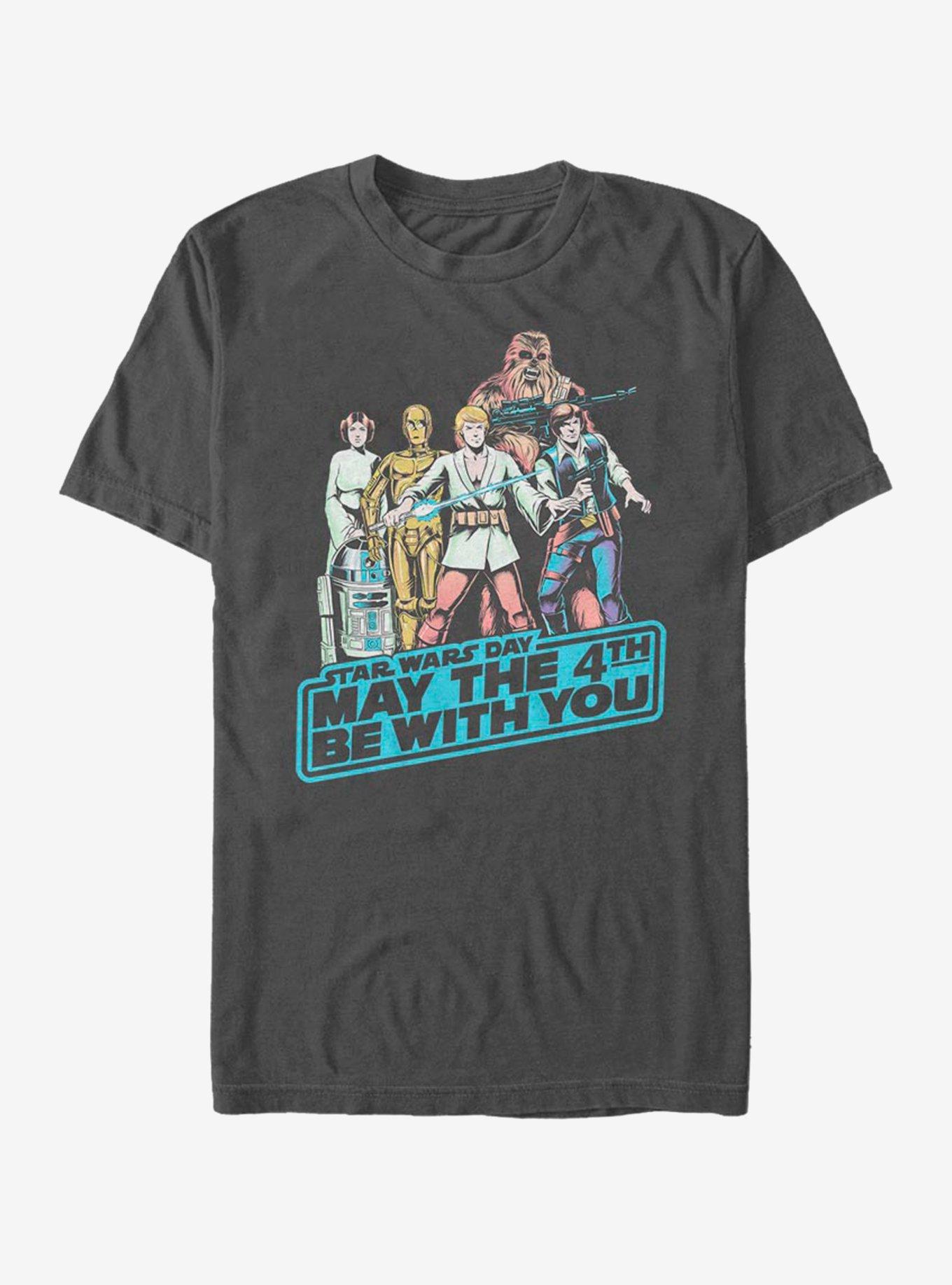 Make every day Star Wars Day! This lightweight tee captures your heroes Chewbacca, Princess Leia, C-3PO, Luke Skywalker, Han Solo and R2-D2 above a May The 4th Be With You logo.