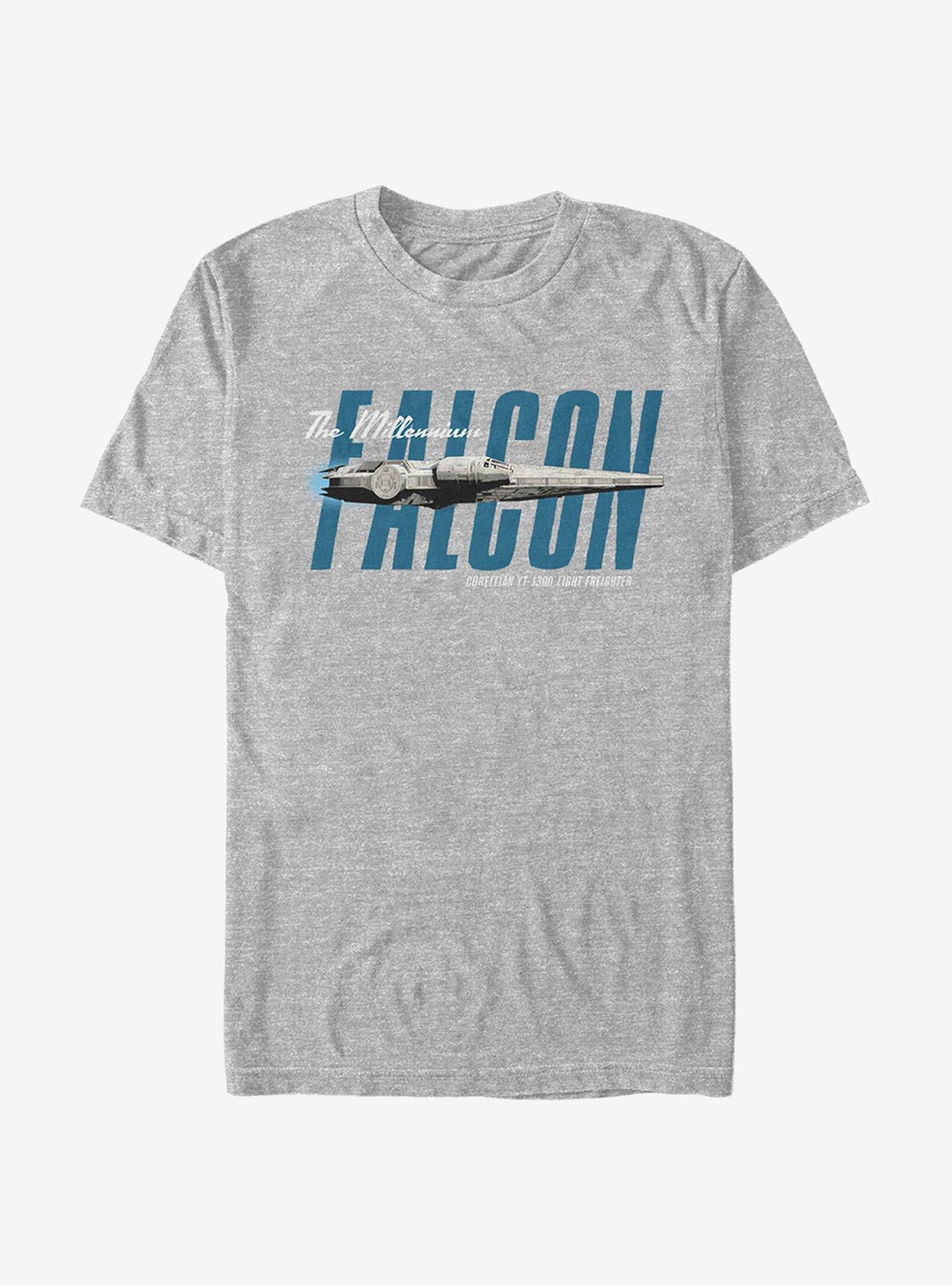Check out the Millennium Falcon when it was all new and shiny on the Solo: A Star Wars Millennium Falcon Profile Men's T-Shirt. This cool men's Millennium Falcon shows off Han Solo's beloved space ship across the front.