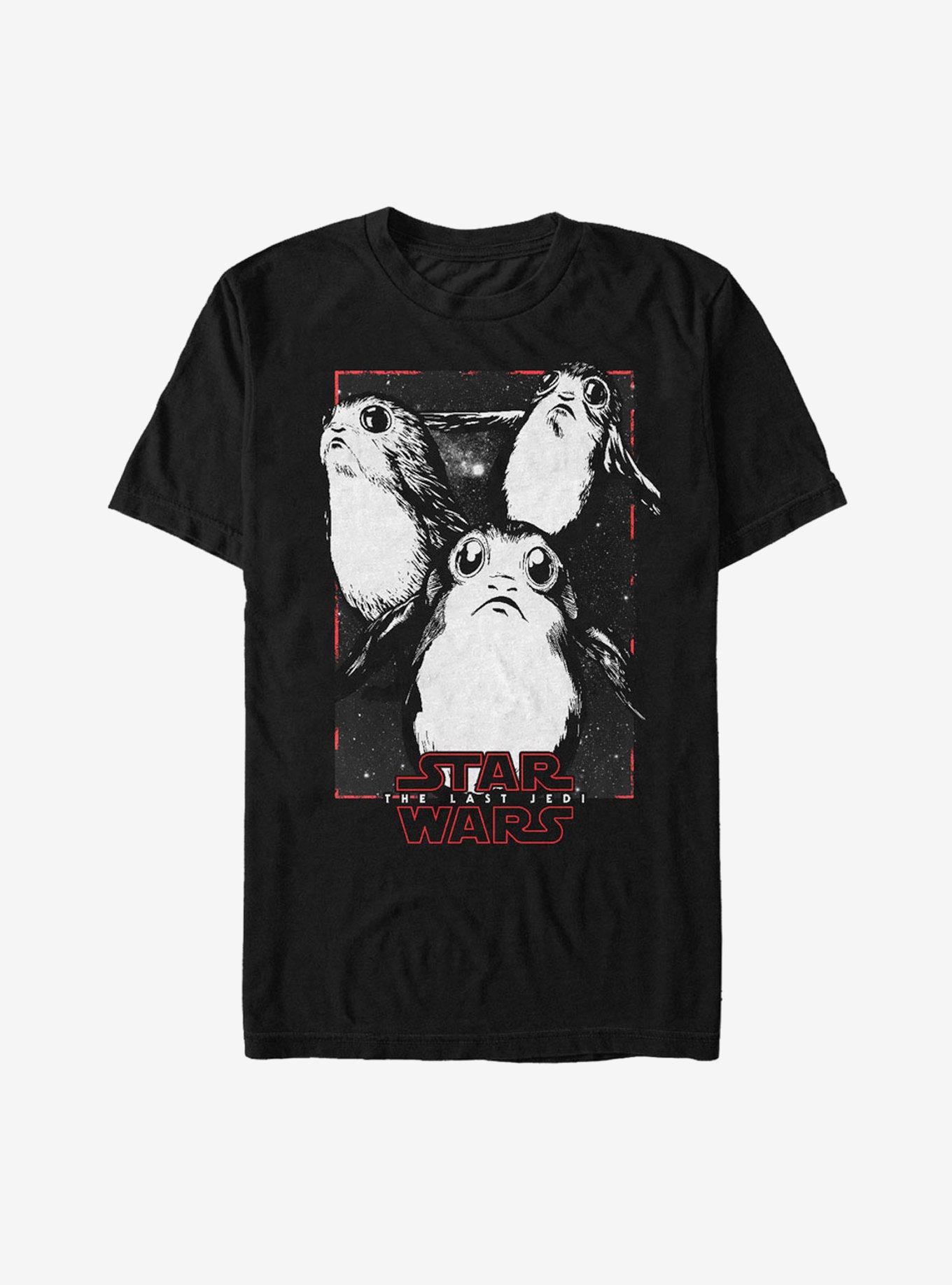 You won't be able to resist the new adorable Porgs or the Star Wars The Last Jedi Porg Grayscale T-Shirt! Three grayscale Porgs flap their little wings across this Last Jedi shirt and right into your heart!