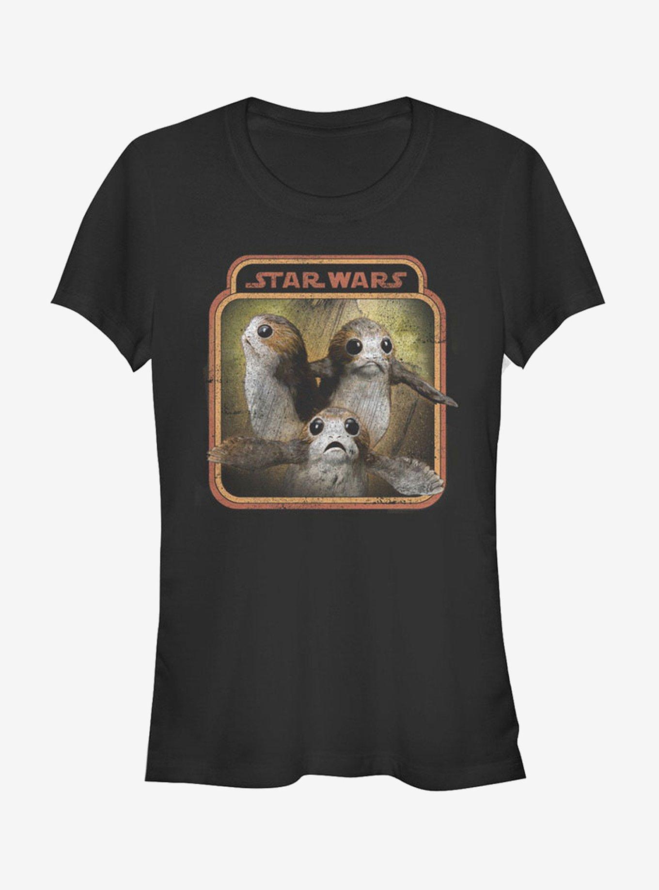 You won't want to leave Ahch-To after you set your sights on the Star Wars The Last Jedi Porgs Frame Black T-Shirt! Three adorable Porgs are framed in a distressed retro frame across this fun fitted black Episode VIII shirt. 100% Cotton.