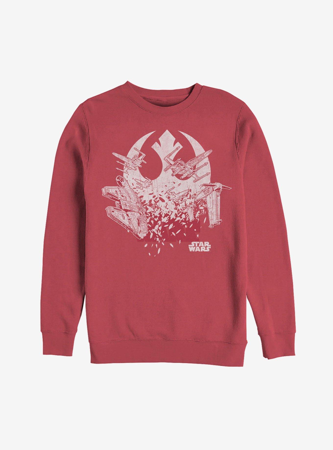 Join the Resistance because they have the best style in the galaxy with the Star Wars The Last Jedi Rey Rebel Ship Splinter Red Sweatshirt! This red Episode VIII sweatshirt shows off the rebel symbol in an epic distressed style that appears to splinter and fleck away at the base, as X-wings and the Millennium Falcon fly around it. 50% Cotton, 50% Polyester.