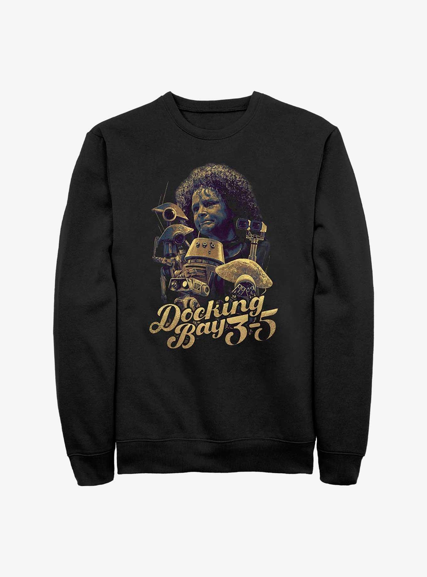 You'll find all the droids you need at Peli Motto's shop in Mos Eisley! This black crewneck sweatshirt -- inspired by the Disney+ series Star Wars: The Book of Boba Fett -- features all things Docking Bay 3-5.