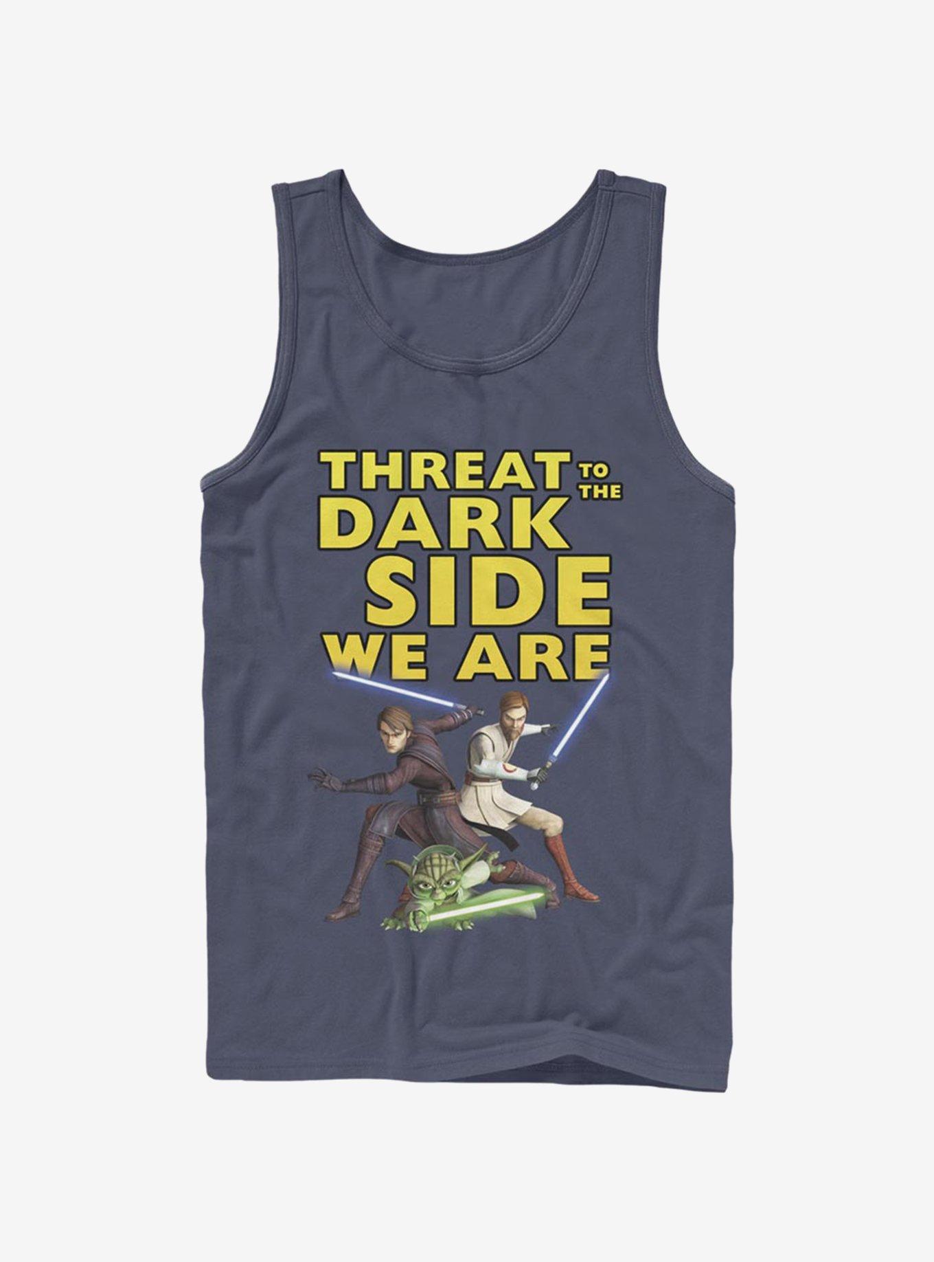 The Force, they have! This navy blue Star Wars tank features Anakin Skywalker, Obi-Wan Kenobi and Yoda -- with "Threat to the Dark Side, we are" verbiage.
