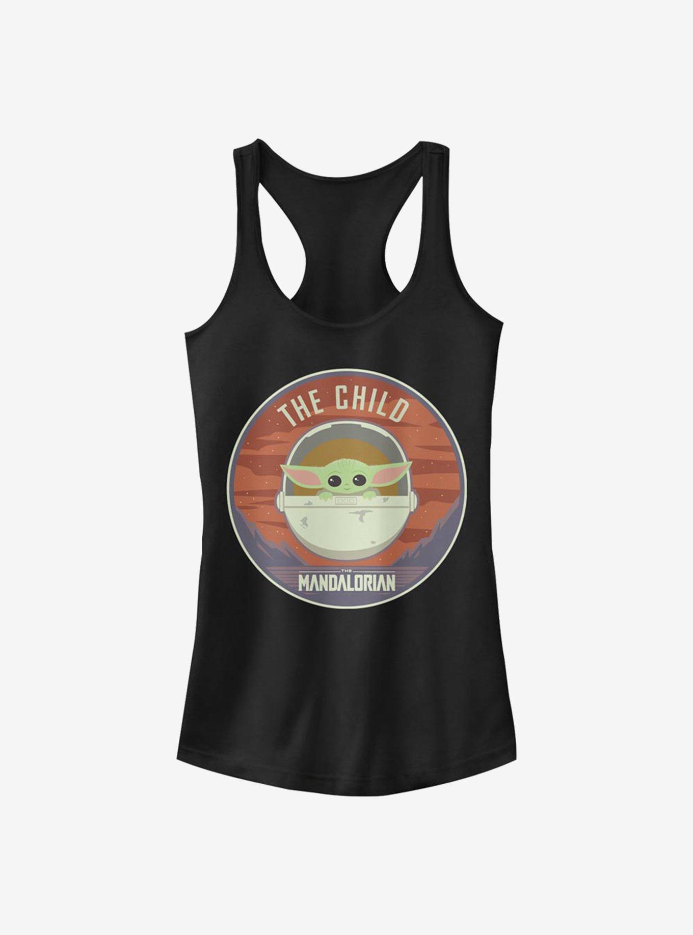 Our other ride is a hovering pram. This black racerback tank -- inspired by the Disney+ series Star Wars: The Mandalorian -- features Grogu, AKA The Child, in his protective capsule.
